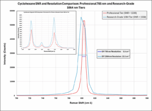 1064 nm DIY Raman provides lower resolution but higher SNR performance than our 785 nm Professional Tier CCD system.
